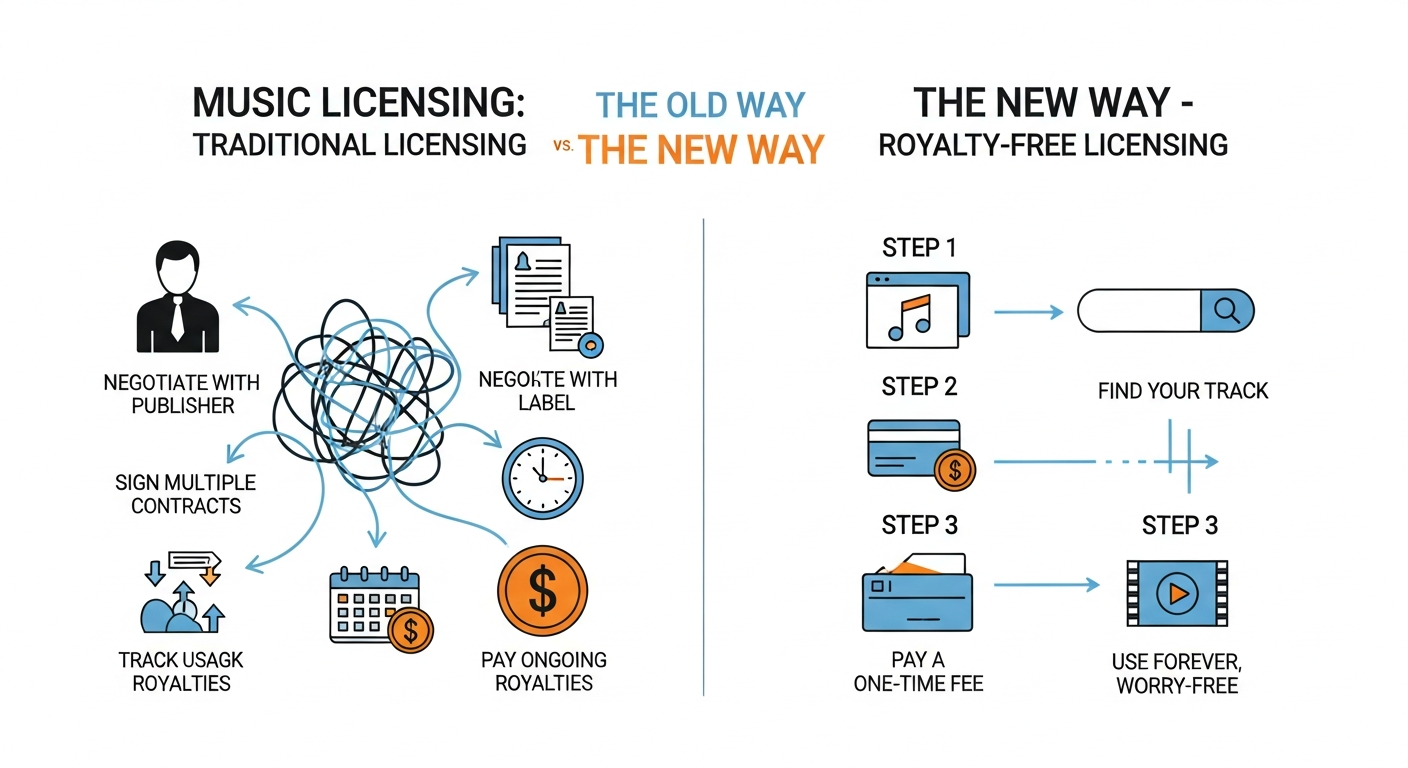 The royalty-free model simplifies the traditionally complex and costly process of music licensing for content creators.