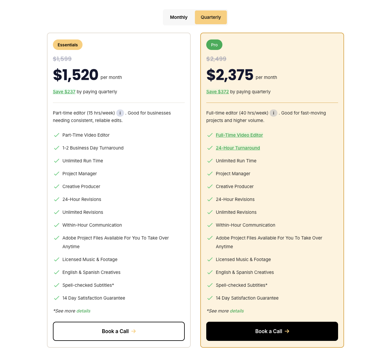 Edit Crew offers a flat monthly pricing model for their video editing services based on editing capacity rather than per-video costs. This structure simplifies budgeting for those producing content regularly or at scale.