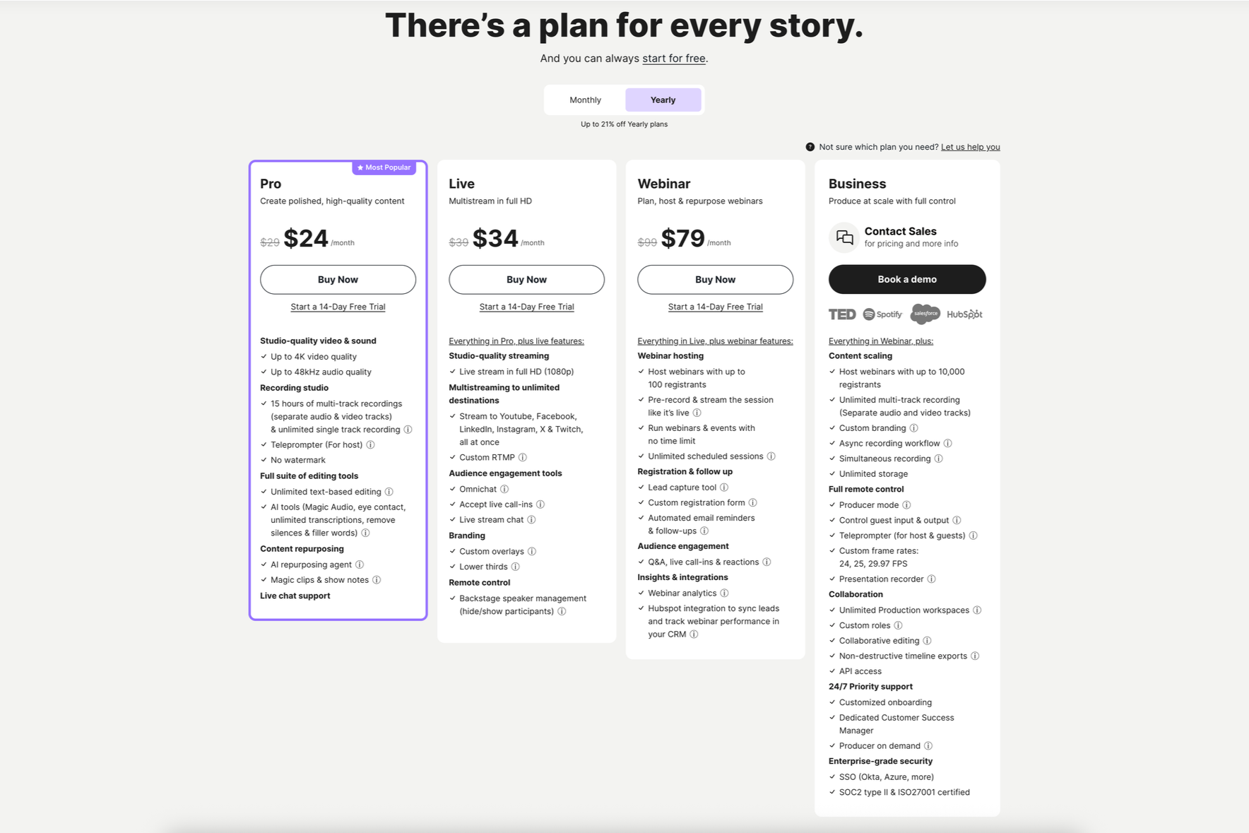 Riverside operates on a subscription model tailored to creators. It offers a free plan with limited multitrack recording hours and watermarking. Paid plans start around $24-$29 per month and scale up, unlocking more recording hours, higher video quality (up to 4K), advanced editing features, and AI tools. This pricing is an investment in production value, where the all-in-one features can save costs on separate transcription and social media clipping services.